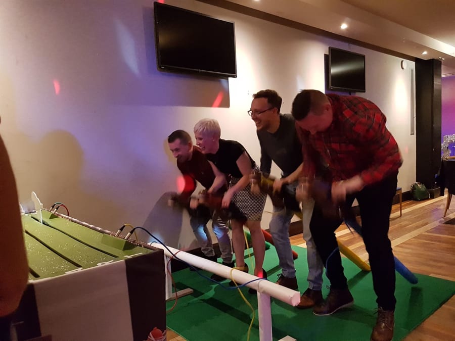 How do you play this simulator game? Each jockey takes their position, placing a colourful hobby horse between their legs and gripping the handles on the horses' heads. It's time to channel your inner jockey and mimic their arm movements. The faster you pump those arms, the speedier your horse will charge along the racing table before you. The first jockey to guide their trusty steed across the finish line will secure their title as the ultimate Gold Cup champion!