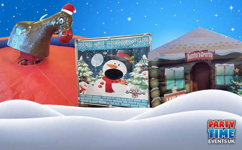 This Christmas party package is great fun for school fairs, youth club parties, staff parties, family fun days and similar. Challenge your colleagues, friends and family to see who can ride the rodeo reindeer the longest and who can score the most points in the snowball fight game then stop by and visit Santa in his grotto!